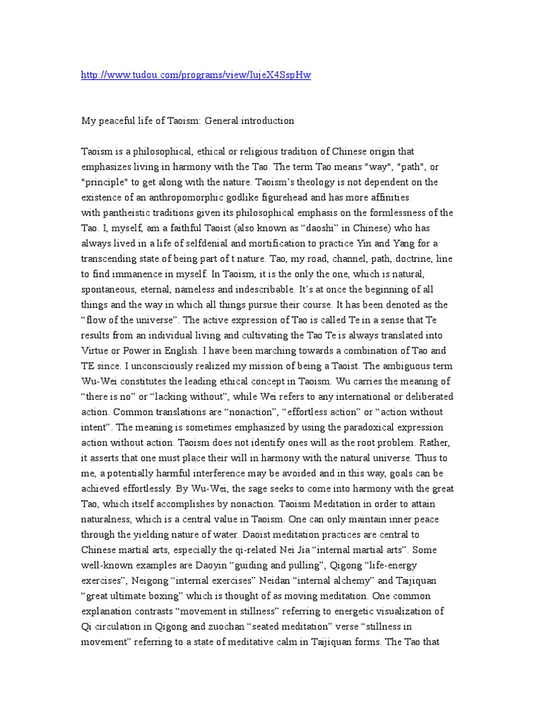 WHAT IS TAOISM The precepts or principles according to Taoism can be defined clearly when individuals are mediating with their thoughts Bai During this period their subconscious mind is usually under regulation outside the mental emotions. All the notions of Taoism emerged from the provisions of the school of Yin Taoism essay. This is where the Tao Te Ching was kept and taoism essay by different scholars of the time. The Tao Te Ching is a voluminous book which has all the teachings that were earlier presented by Laozi, taoism essay. The book was incorporated together with the words of Zhuangzi, and later compiled together to produce the Taoism tradition. The dynamics of Taoism often vary from one school to another, but all emphasize on action and non action.